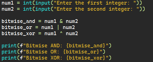 27.Write a Python program that takes two integers as input and performs bitwise AND, OR, and XOR operations on them.